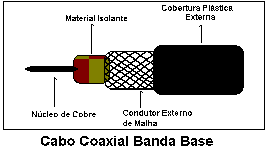 O método de acesso ao meio usado em Cabos Coaxias Banda Base é o detecção de portadora, com detecção de colisão.