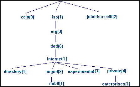 Sob o nó iso(1), estão outras subáarvores, como é o caso da subáarvore org(3), definida pela ISO para conter outras organizações. Uma das organizações que está sob a subáarvore org(3) é o Departamento de Defesa dos EUA (DOD), no nó dod(6). A Internet(1) está sob o dod(6), e possui quatro subárvores:
